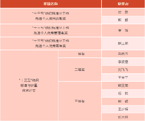 中纺标标准事业部总经理章辉荣获“‘十三五’纺织标准化工作先进个人优秀管理者奖”;中纺标标准事业部高级工程师韩玉茹荣获“‘十三五’纺织标准化工作先进个人优秀青年奖”。