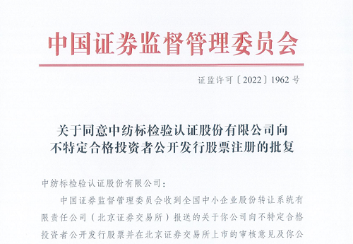 8月31日,据北京证券交易所官网公告,中国证监会同意中纺标检验认证股份有限公司向不特定合格投资者公开发行股票的注册申请。这意味着,中纺标登陆北交所再进一步,将在近期启动股票发行。
