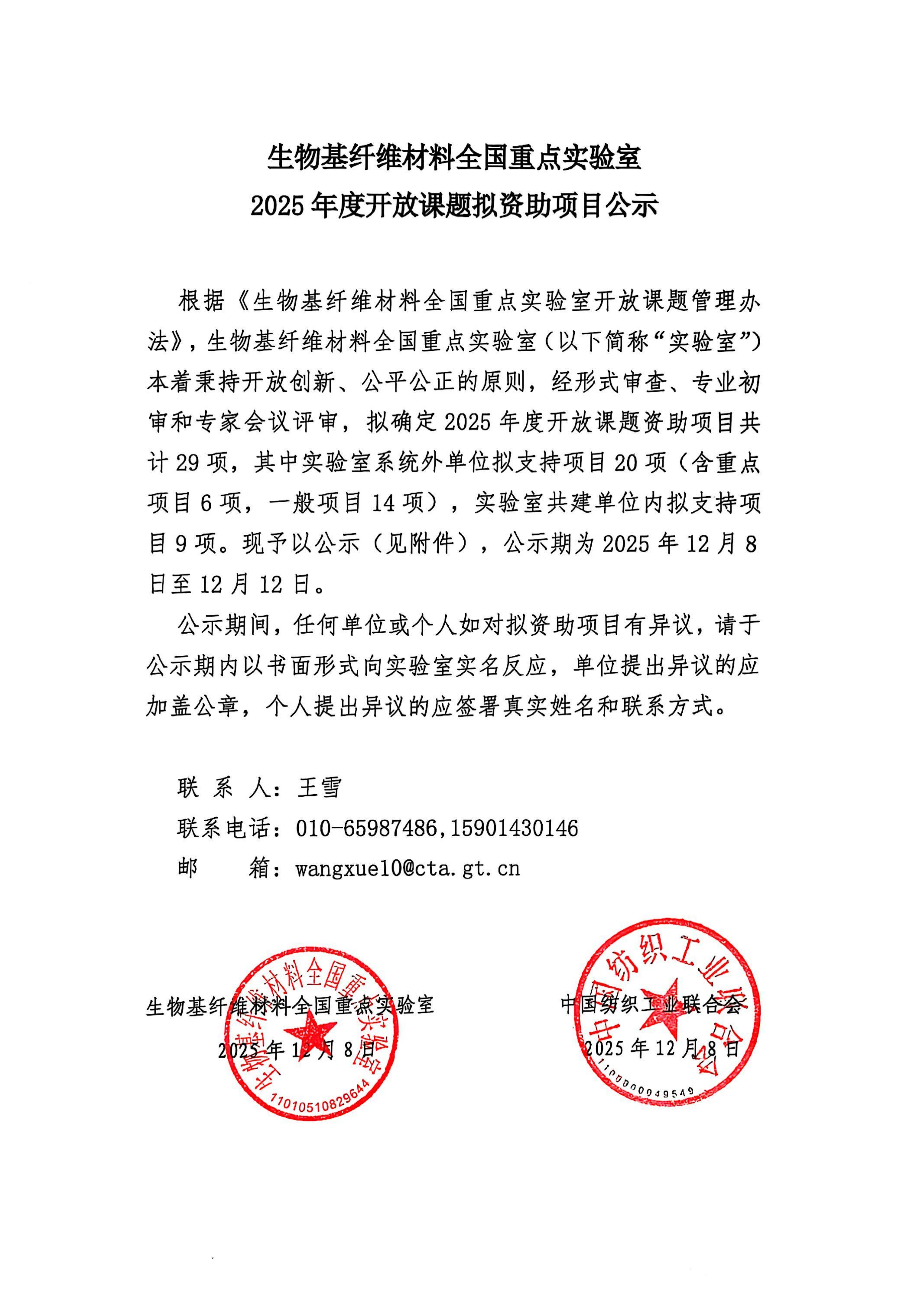 生物基纤维材料全国重点实验室2025年度开放课题拟资助项目公示